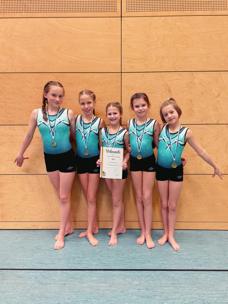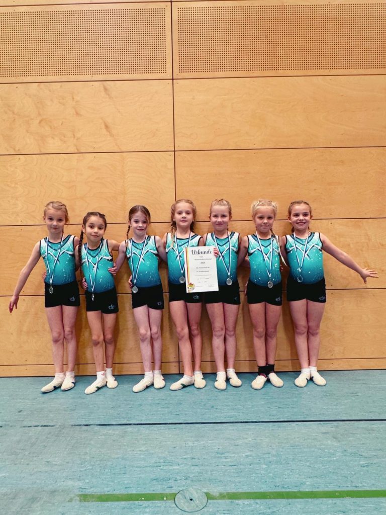 Im Wettkampf Jahrgang 2015 und jünger ging die Mannschaft mit Lilly Heinkel, Sina Becker, Emma Neis, Theresa Schirmer, Emma Schaffer, Johanna Schramm, Enissa Dizer an den Start. Sie sicherten sich mit 13 Punkten Vorsprung den ersten Platz. Mehrere Turnerinnen zeigten ihre ersten Überschläge über den Tisch und viele Salti am Boden. Die stärksten Geräte dieser Mannschaft waren Boden und Trampolin. Sie haben drei weitere Mannschaften geschlagen.